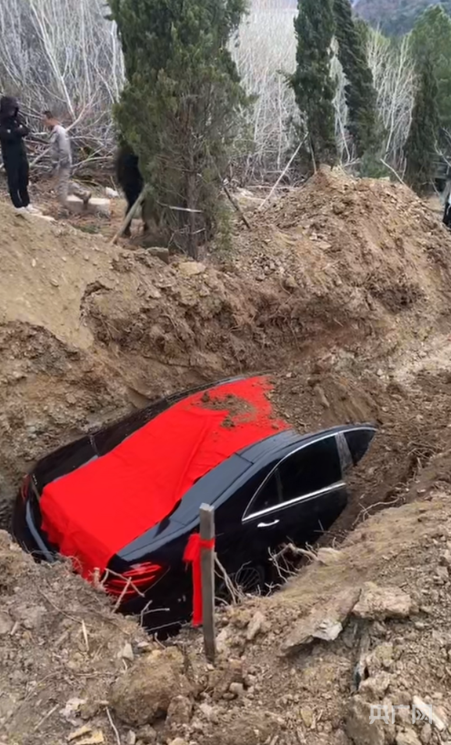 此前媒体发布的现场视频显示,一座刚修好的墓碑旁边,一辆挖掘机将一辆黑色奔驰轿车吊起,多人合力将汽车推入挖好的墓坑。随后,车辆被埋入土中。另一则视频显示,该车是一辆黑色奔驰S级轿车,车牌号为“辽*8888*”,车辆顶部覆盖着红布。视频引发关注后,不少网友对该行为提出质疑。