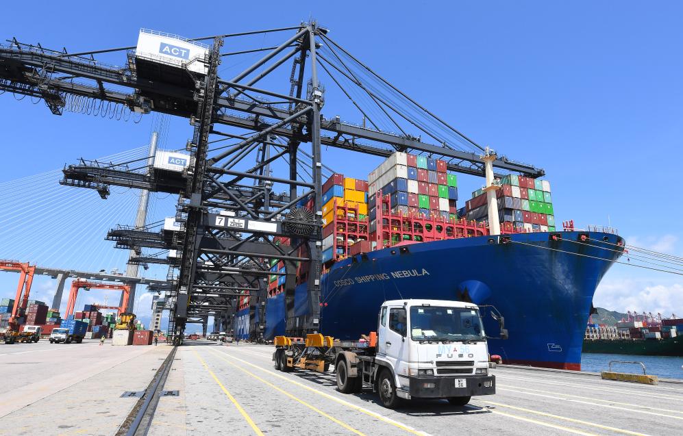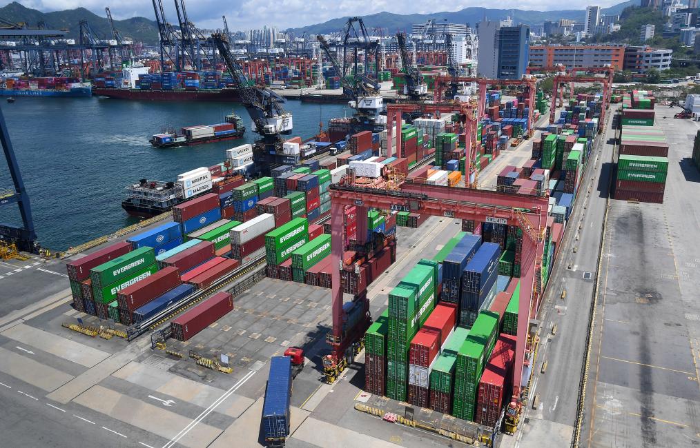 2025年5月22日,一艘货轮在香港货柜码头装货。新华社记者 陈铎 摄